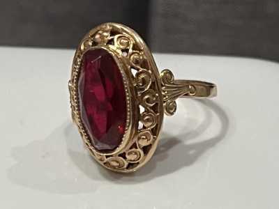 Золотое кольцо с рубином, 583 проба (СССР) Вставка: овальный рубин Дизайн: ажурный узор с восточными мотивами, массивная...