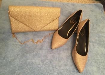 Продам праздничный комплект туфли и сумочку золотистого цвета . Туфли абсолютно новые .