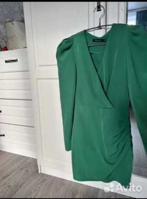 Брендовое платье, на размер 40-42, отлично подчеркивает ваши достоинства. Здорово будет с объемным блейзером.