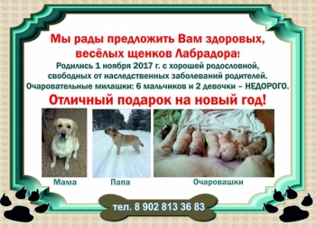 Предлагаем к бронированию и дальнейшей продаже щенков лабрадора черного и шоколадного окраса с документами РКФ от родителей...